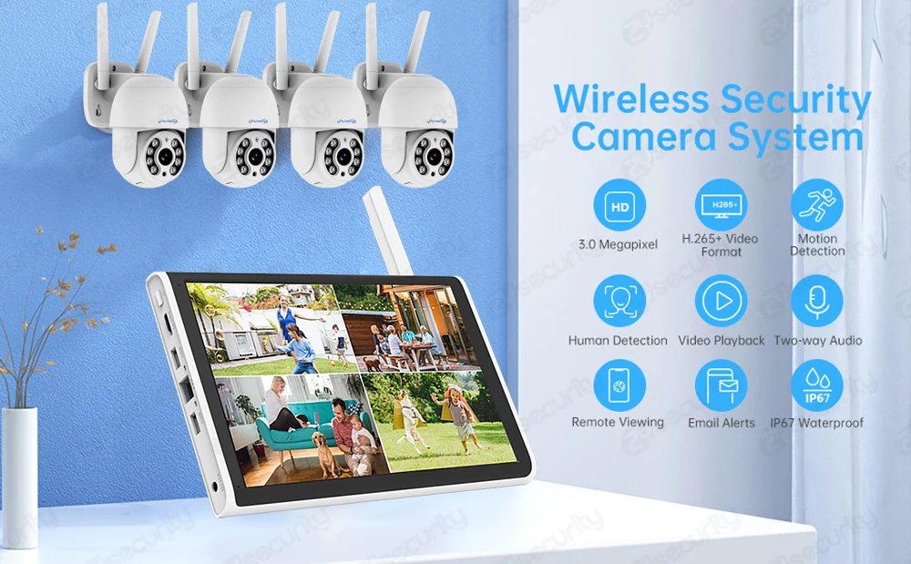 3MP Wireless Surveillance Kit Outdoor WiFi IP PTZ Security Camera System 8CH NVR Kit with 10.1 Inch Monitor Home Mornitoring Set