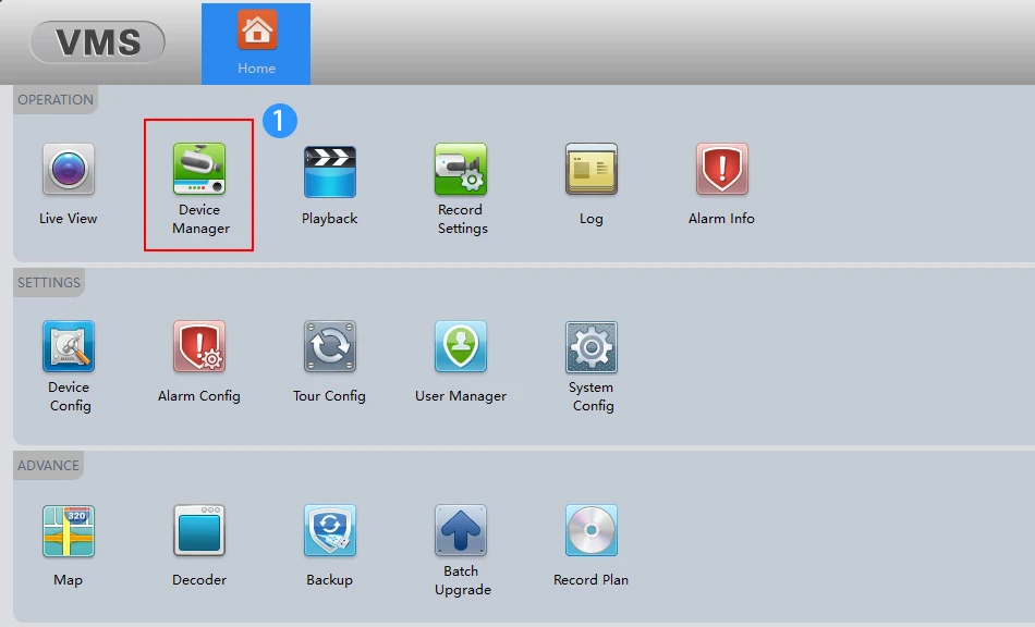 When you log in to VMS for the first time, Device list is empty, Please add your device at "System->Device Manager"