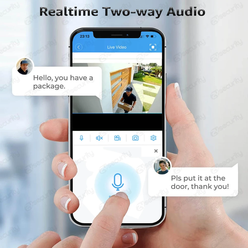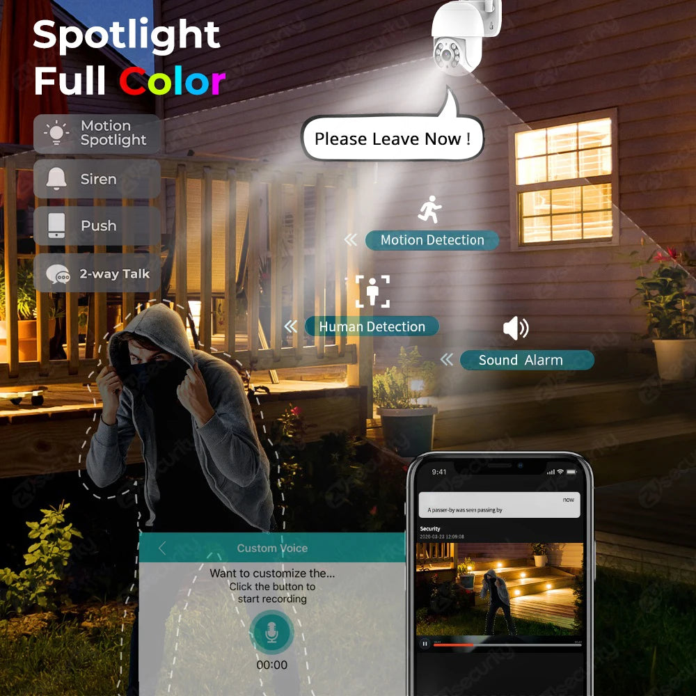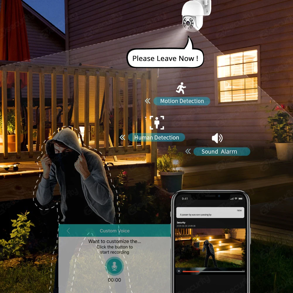 Once an intruder is detected, the camera’s Spotlight and siren will be triggered or manually activated to warn off the would-be criminal. Stop the crime before it happens. and the alerts message will send to your mobile phone.