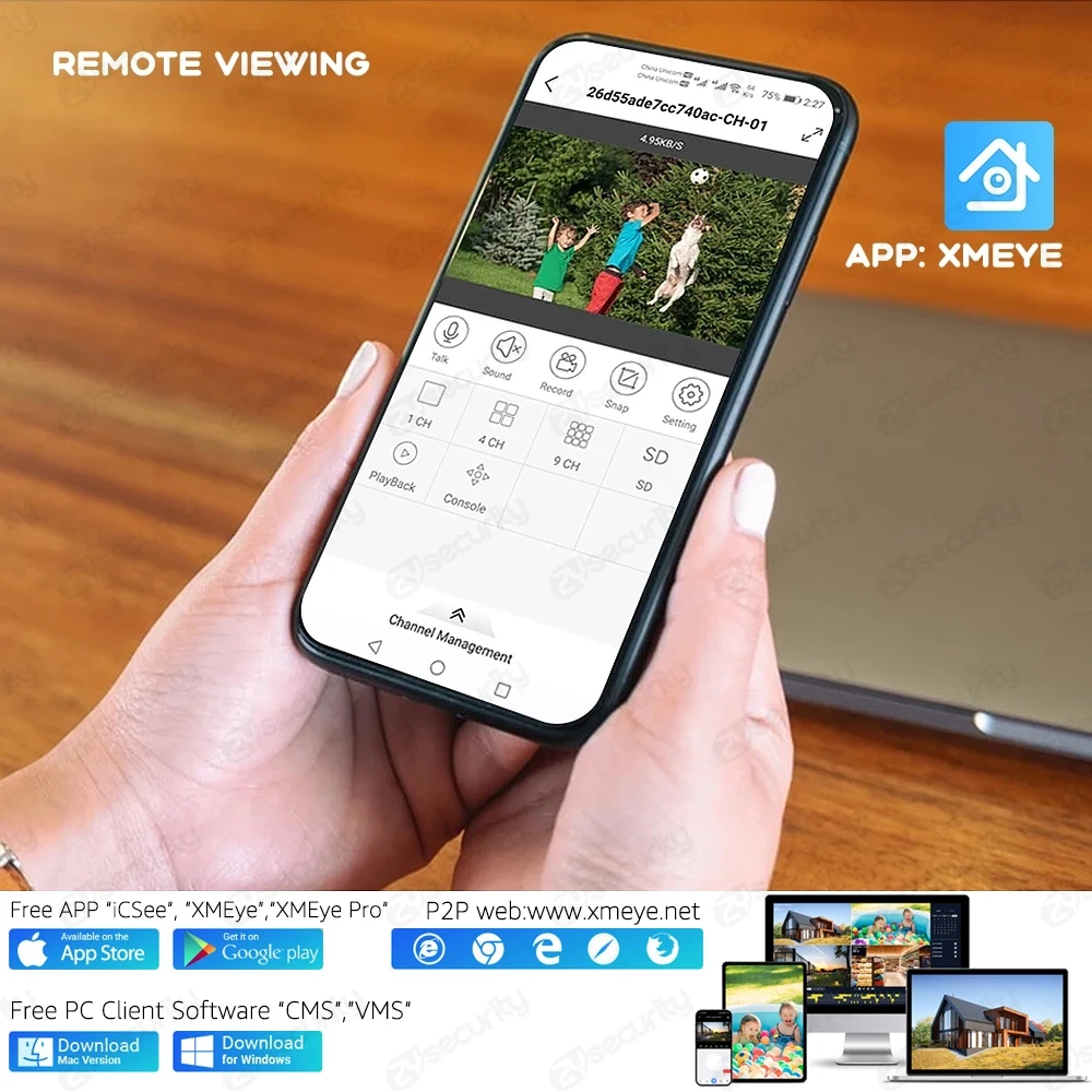 Enjoy simultaneous viewing of up to 8 wireless cameras on the app "XMEye Pro" on your phone, windows computer or laptop. Get "XMEye Pro" form app store or google play. Email with order number to get app for pc.