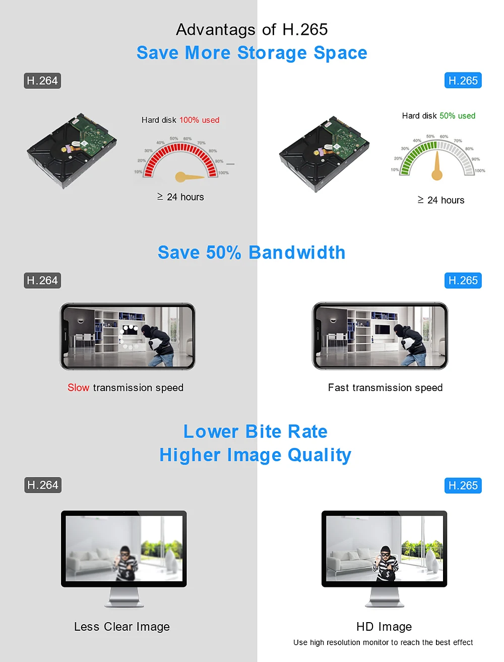 ●H.265X new storage design, TF card storage space is less than H.264, more stable and more durable.