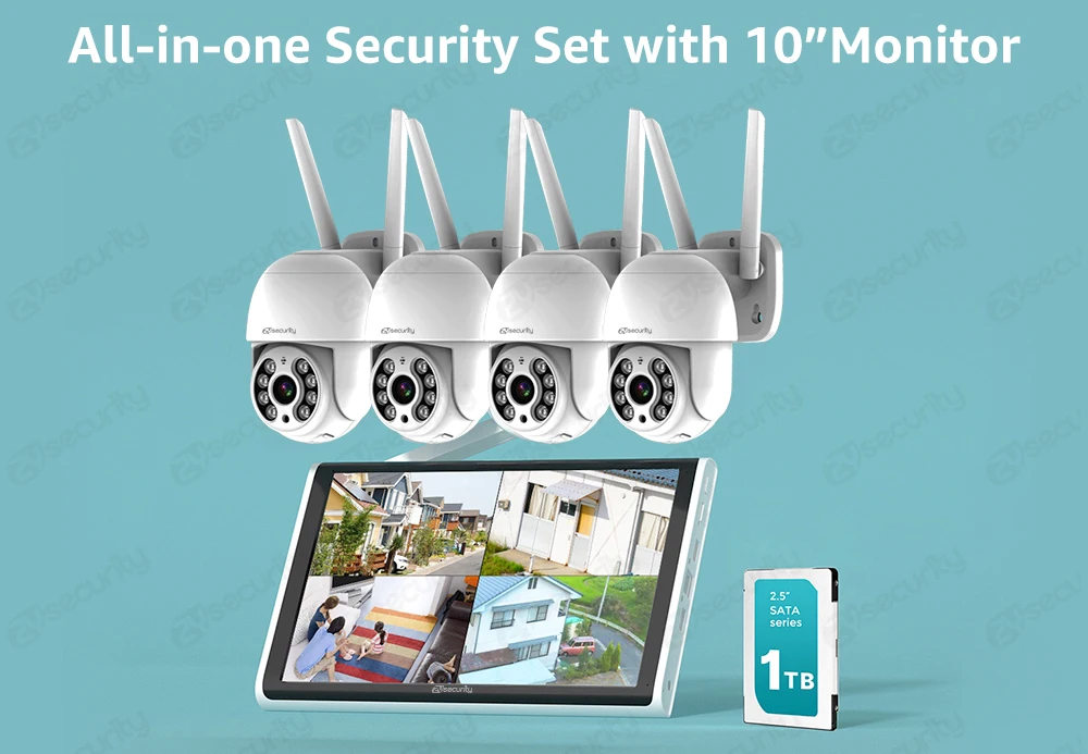 This wireless security camera system with 10.1 inch monitor, you can have a high definition image during the real time monitoring, you don't have to buy a seperate screen, save more money, and more space. You just need power on the camera and NVR, then the images will show on the screen for you. The real plug and play. And you can view up to 8 cameras at the same time on the screen.