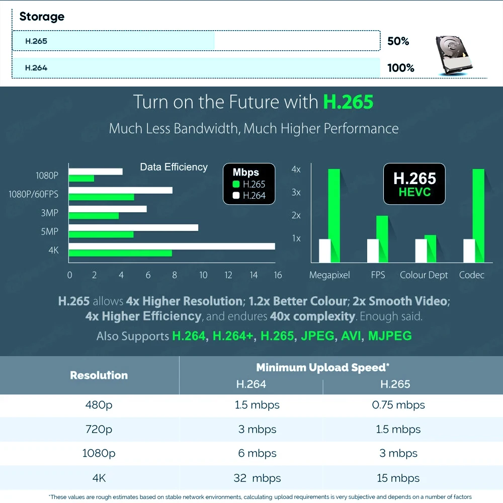 H.265 (HEVC) doubles the coding efficiency compared with its predecessor H.264. That means H.265++ video saves around 70% of the bit rate at the same quality of coding.
