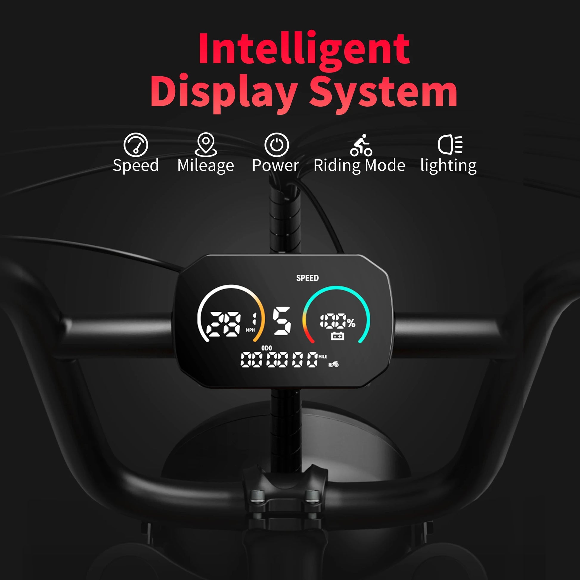 【Digital LCD Display】Stay in control and informed with the LCD display screen that provides real-time information on your speed, battery level, and more. Enjoy a smooth and comfortable ride, even on rough terrain, with the dual suspension system that absorbs bumps and shocks, ensuring every journey is a pleasurable one.