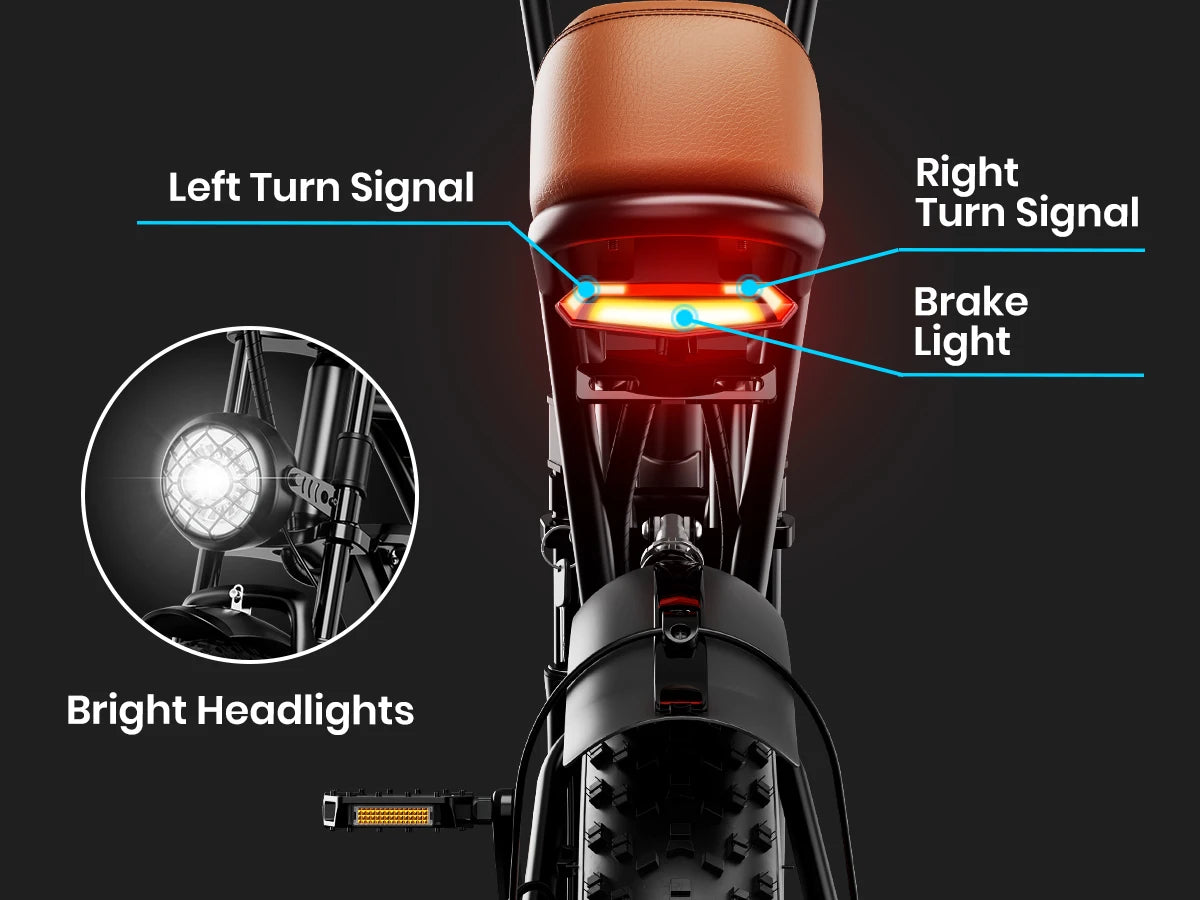 【Shimano 7 Gears&Dis Brakes System】 Ride with confidence, day or night, the bright headlight, rear turn signal and brake light alert others to your presence.With the gears 7-speed and dual disc brakes, you can effortlessly shift gears and confidently stop, giving you full control over your riding experience. Choose from three working modes - pure electric, pedal-assist, or pure pedal - to suit your preferences and make every ride tailored to your needs.