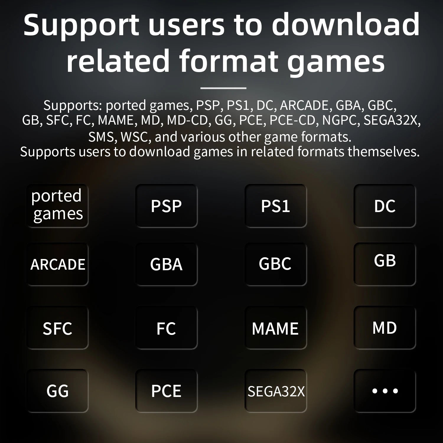 Supports: ported games, PSP, PS1, DC, ARCADE, GBA, GBC, GB, SFC, FC, MAME, MD, MD-CD, GG, PCE, PCE-CD, NGPC, sega32x, SMS, WSC, and various other game formats. Supports users to download games in related formats themselves. |