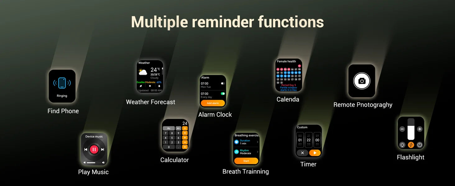 Function: Dialing, frequently used contacts, call log, pedometer, sleep, heart rate, workout, blood pressure, weather, camera control, blood oxygen, music control, stopwatch, alarm, timer, sedentary reminder, breathing training, calculator, messages, brightness adjustment, mute, QR code, shortcut centre, find your phone, heart rate alert, voice assistant, stress monitoring, etc.