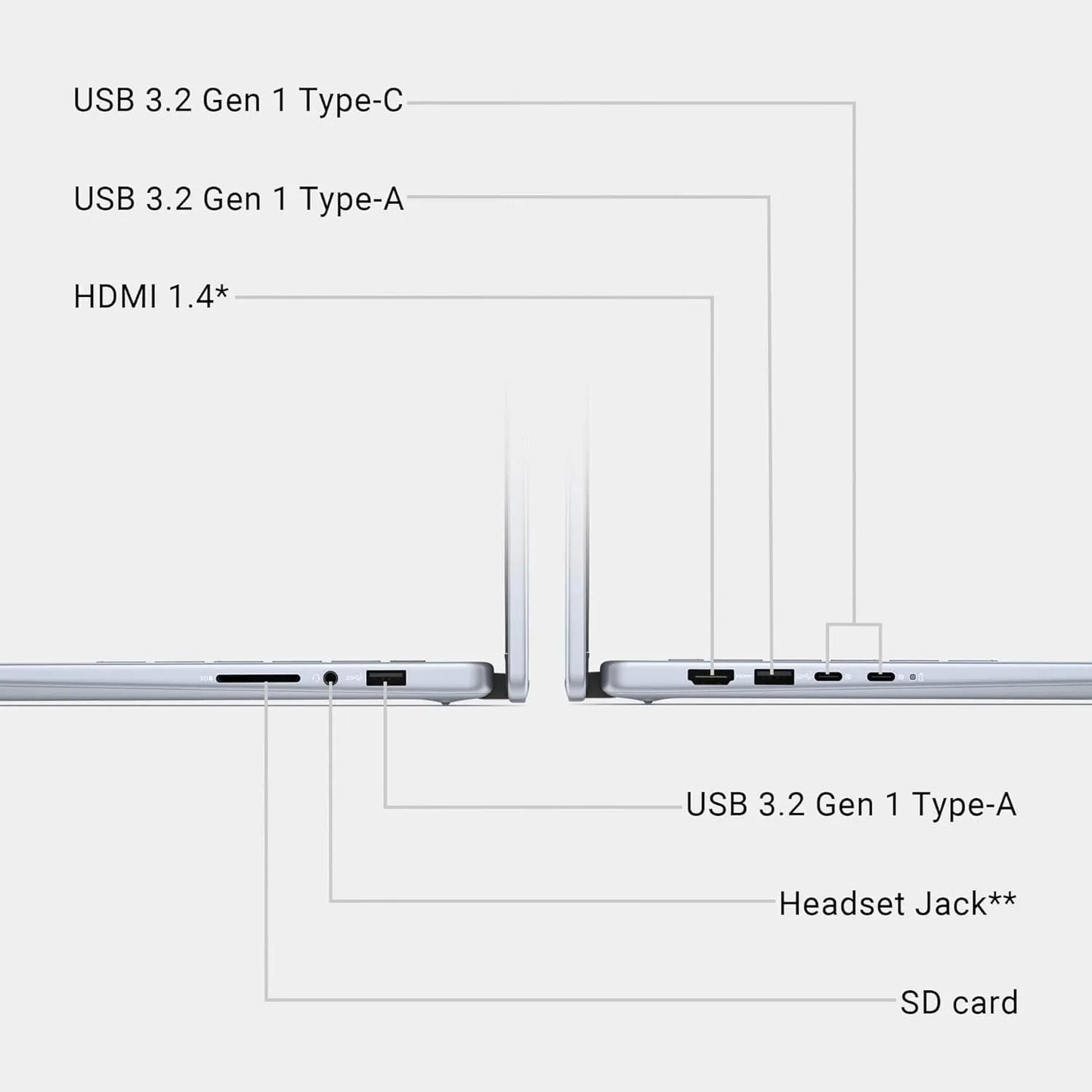Stay connected wherever you go with Wi-Fi 5 and Bluetooth capabilities. The Dell Inspiron laptop offers a variety of ports, including 2 x USB-A 3.2, 2 x USB-C 3.2, 1 x HDMI 1.4, a headphone jack, and a microphone input. These connectivity options allow you to easily connect peripherals, transfer data, and connect to external displays or audio devices.