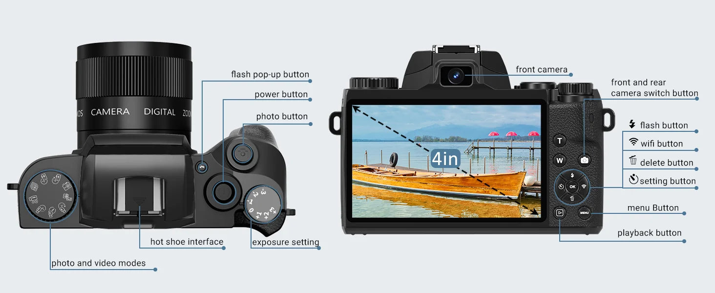 [4.0" Touch Screen & Dual-Lens camera] This camera supports 4.0-inch touch screen. Equipped with dual lens,easy switching to front camera, you can see what you are recording or the picture framing while doing self blogging