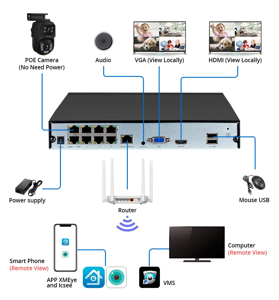 1. Simple Power Supply: only need to power the recorder or switch to propagate to many cameras;