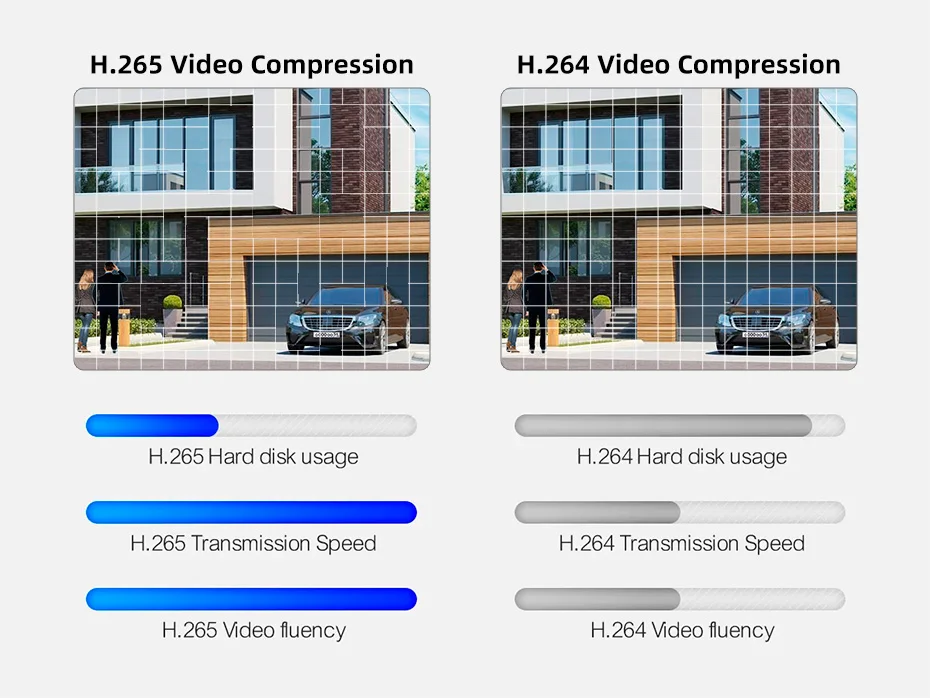 NVR Kits Adopt advanced H.265 video compression, reduce 50% file size, and keep the same quality compared to H.264.