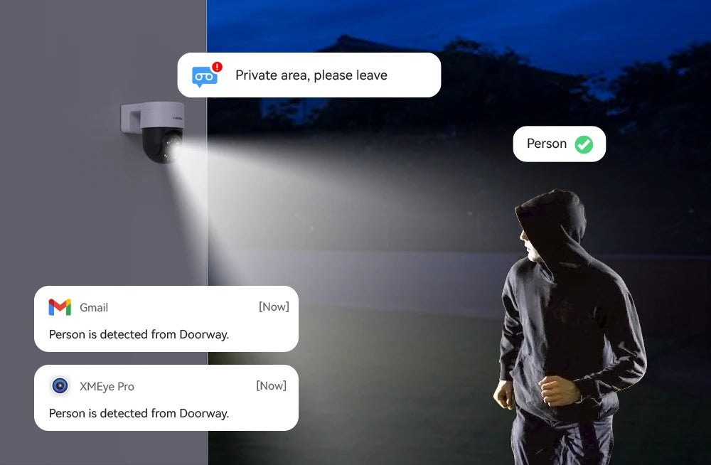 Once an intruder is detected, the camera's spotlight and voice warning are triggered to alert potential criminals. And push alerts to your mobile device and email.