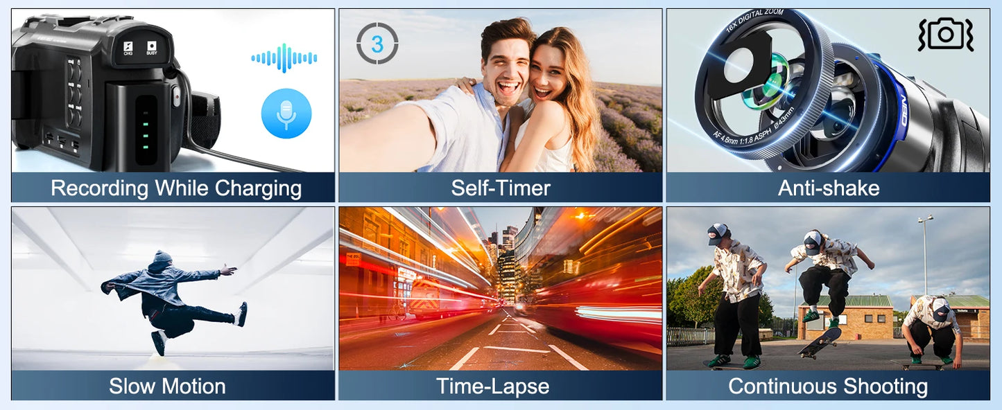 16X Digital Zoom for Clear, Crisp Shots: NBD’s 4K camcorder includes 16X digital zoom, allowing users to get up close to the action without sacrificing image quality. Whether zooming in on distant landscapes or capturing close-up details, every shot will be clear and vibrant.