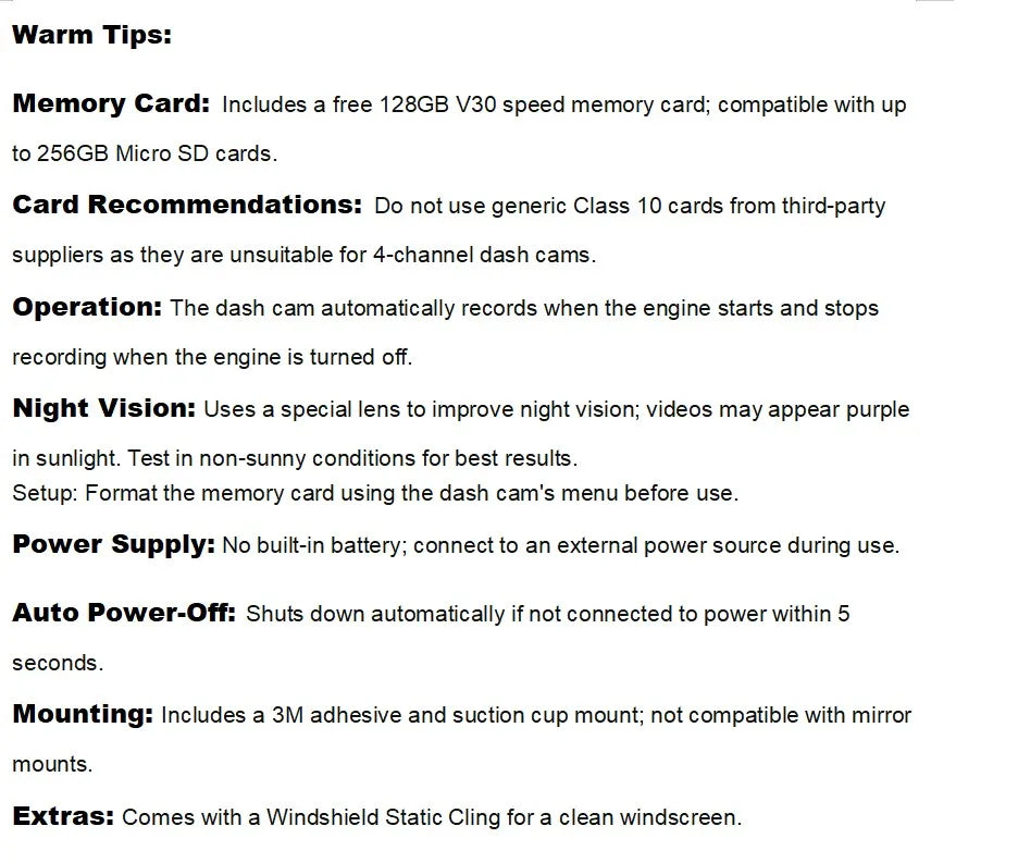 After much analysis, we have found that most of the problems of the dash cam are caused by the memory card because the speed and number of erase and write of the memory card cannot meet the requirements. Therefore, the package comes with a free 128GB V30 speed memory card, 1500 times erase and write, this memory card has been tested many times, especially for the D90-4CH-MINI dash cam, which has 4 FHD lenses. It is more durable than the high-end memory cards on the market, which can make the D90-4CH-MINI car dash cam more stable, reliable, and working continuously for a long time. Therefore, we recommend that you use the memory card provided by us