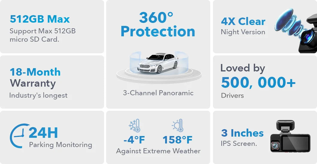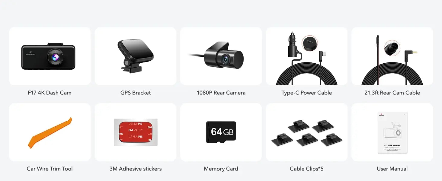 The REDTIGER is equipped with a G-sensor gravity sensor, which can automatically detect collisions and sudden events. It automatically locks and protects the relevant video clips, preventing them from being overwritten. In the event of a sudden emergency braking incident, the G-sensor emergency recording feature of the REDTIGER is triggered immediately, automatically locking and saving the relevant video clips. This allows you to view and use these recordings as evidence at a later time.The REDTIGER is equipped with a built-in 5G WiFi module, which supports fast data transmission. It offers a transmission speed that is four times faster than traditional WiFi, allowing you to quickly view, download, and share video footage files.The REDTIGER features a comprehensive upgrade to its night vision capabilities. It can provide clear images even in dark conditions, ensuring your safety during nighttime driving.What's In the Box?