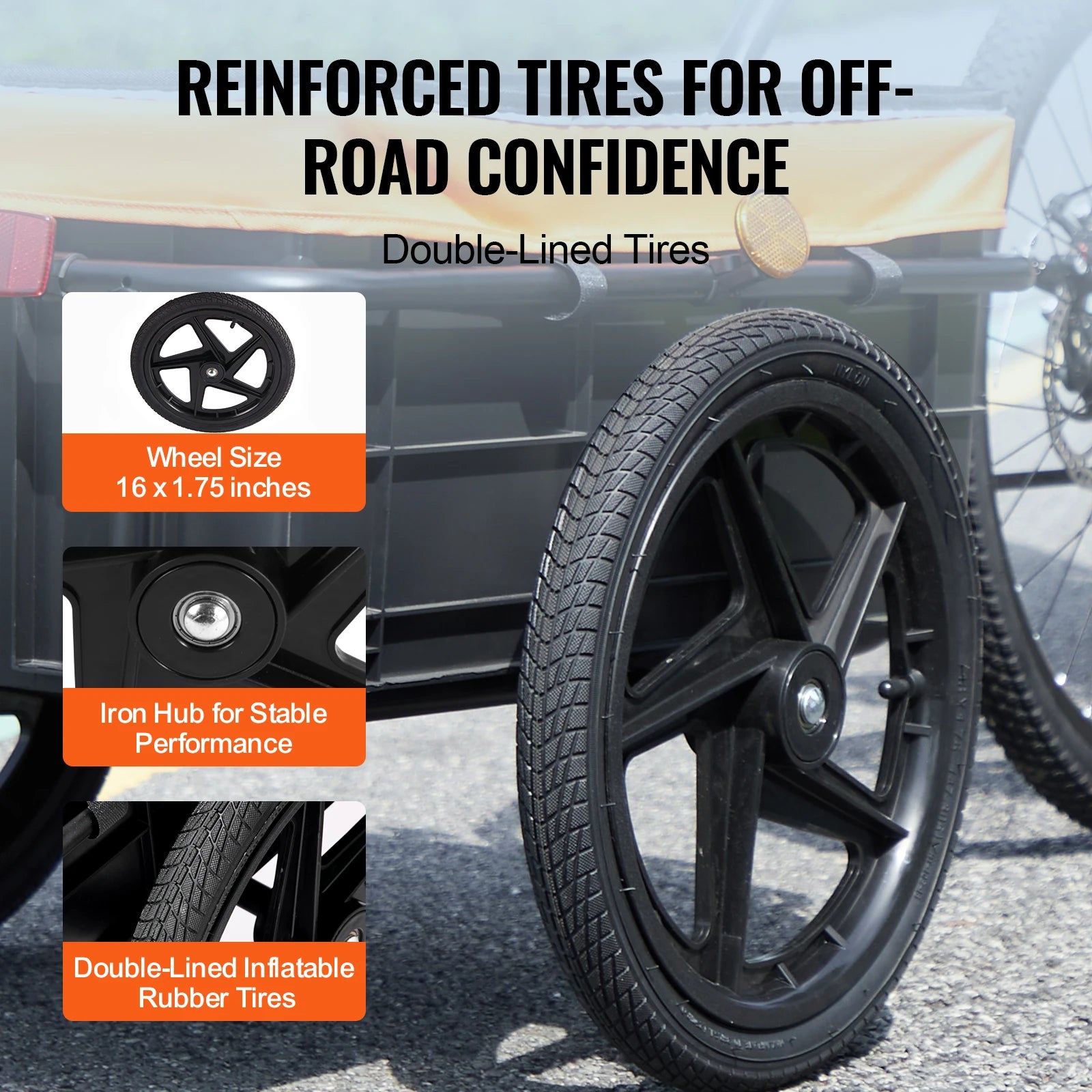 Professional Tire Design: Roll smoothly on any road! Our bike trailer comes equipped with sporty 16" x 1.75" tires and iron hubs, providing excellent stability and traction on various surfaces, whether you're cruising on concrete, navigating gravel paths, or tackling sandy trails.