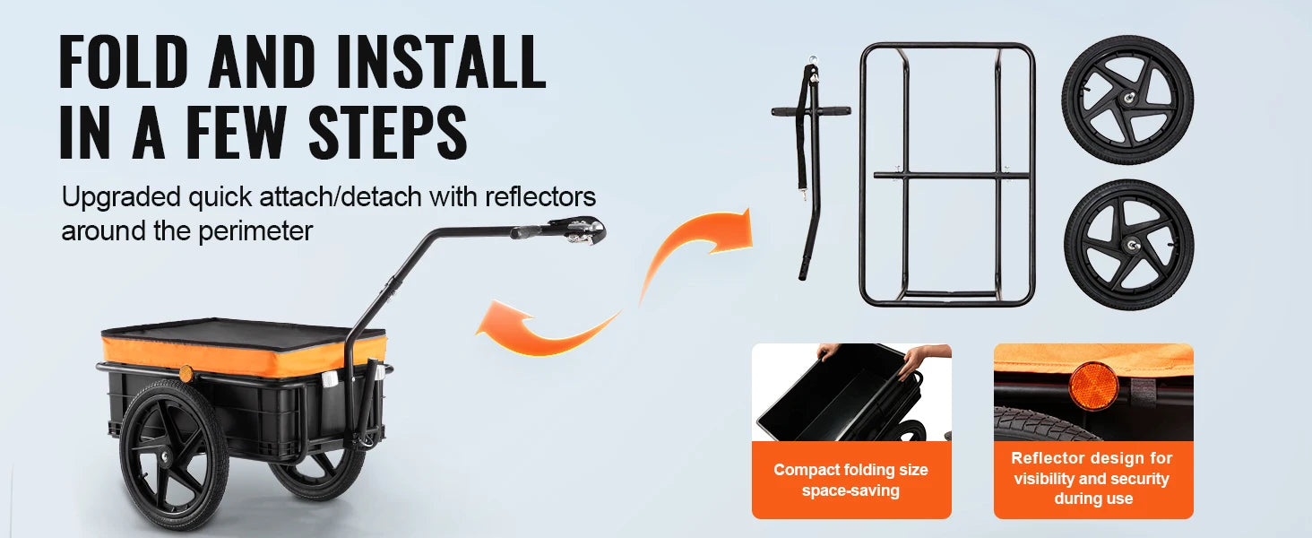Upgraded Installation: Easy setup, enhanced security! Installing our bike wagon is a breeze, thanks to its user-friendly design and complete installation toolkit. Plus, stand out on the road with gold-colored spoke reflectors, ensuring visibility during nighttime rides.