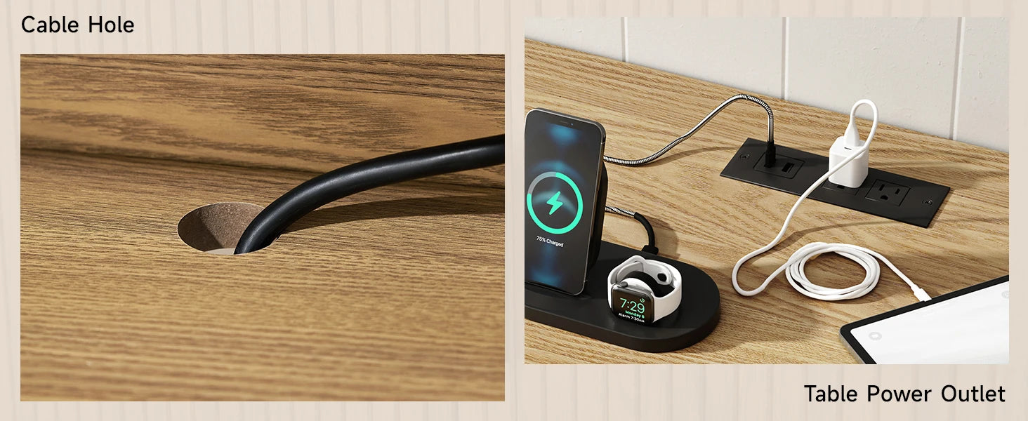 This TV stand with power outlet has built-in 2 USB ports and 2 standard power outlets, which provide convenience for you to connect various electronic devices such as televisions, audio systems, and game consoles. Moreover, 3 cable holes allow for easier organization of tangled wires, keeping your home tidy