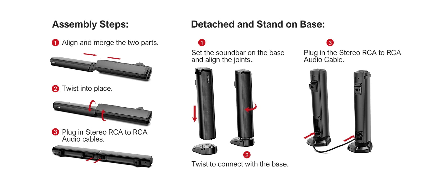 - The soundbar's detachable design allows you to assemble it in a variety of styles to fit the layout and atmosphere of your room. The split design saves space while the unique 7° tilt design enriches the soundstage with exclusive details.