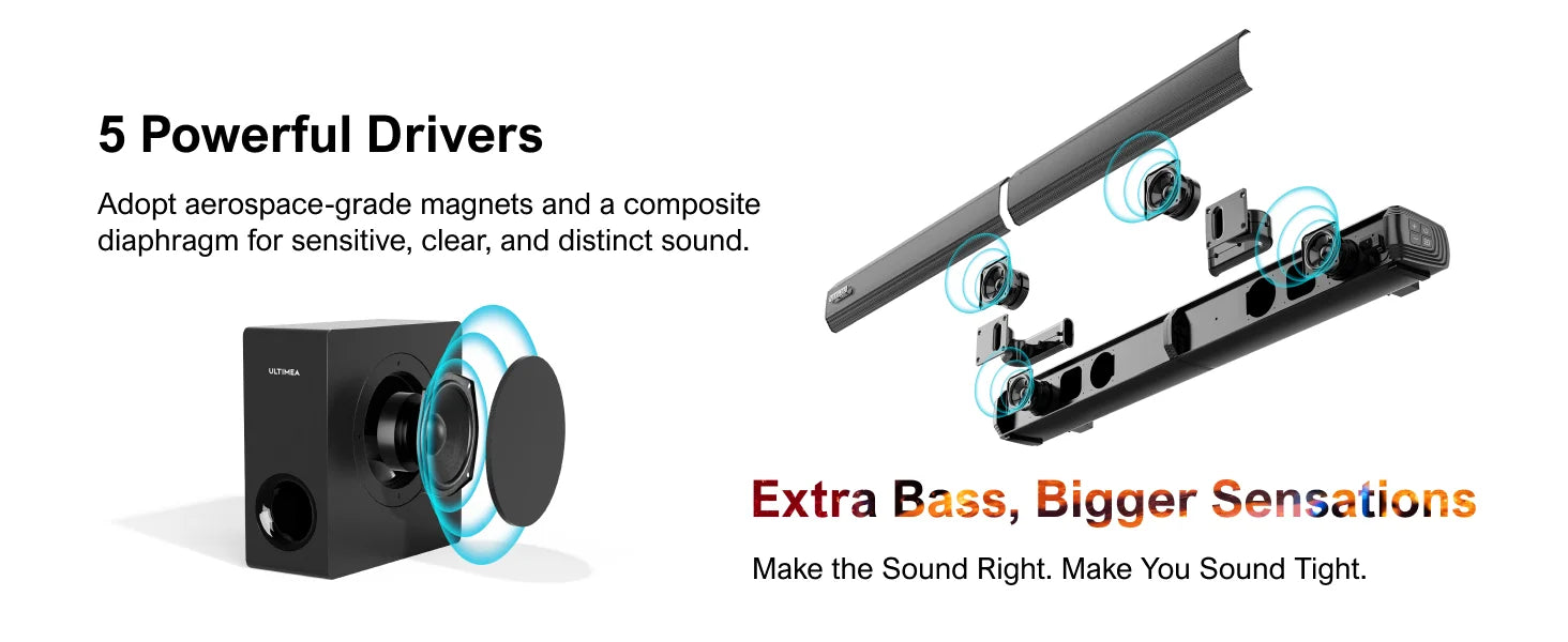 - Elevate your audio with 3 EQ modes designed for music, movies, and games. Ultimea exclusive BassMX technology enriches the low frequencies, enabling adjustable bass for a rumble, pulse-pounding Bass. All of these modes are easily accessible with a touch of a button on the EQ settings.