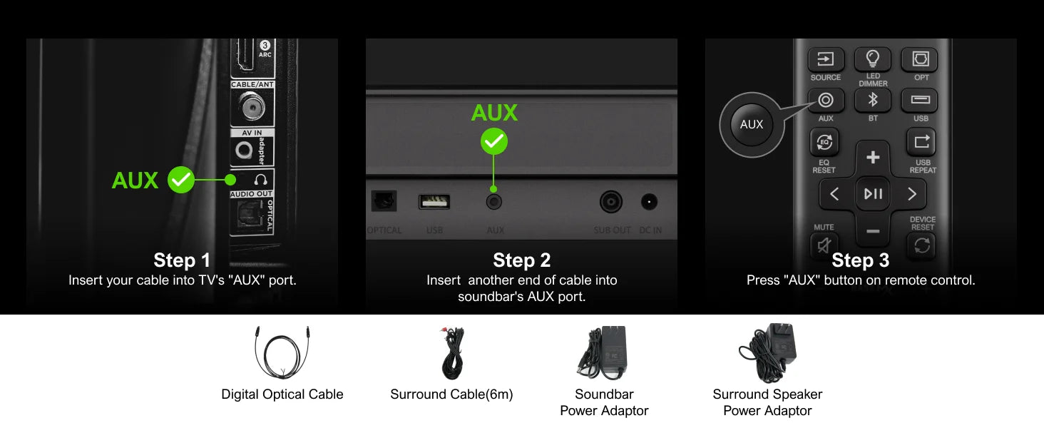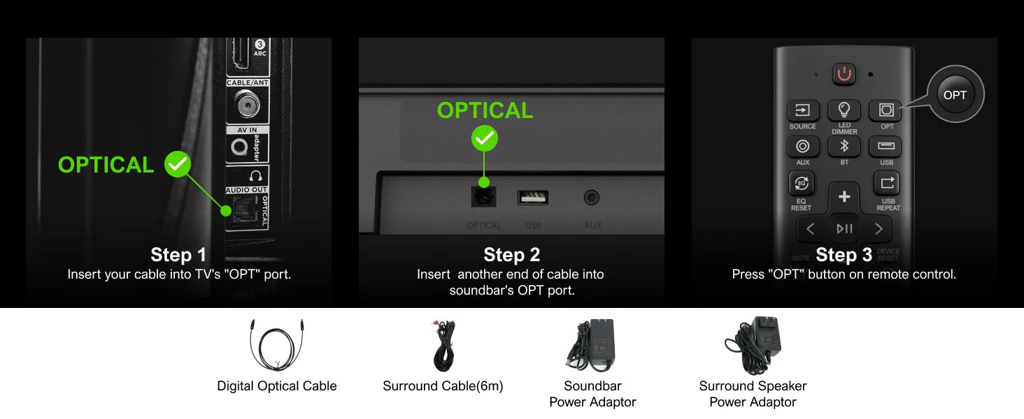 Enjoy hassle-free setup with our hybrid wired/wireless design. Simply connect both surround speakers with a cable, power the right speaker for wireless pairing, and if needed, position the speakers and soundbar within 45 cm. Then, press and hold the remote’s SURROUND button for 5 seconds, followed by the PAIR button on the right speaker for 5 seconds to lock in the connection.