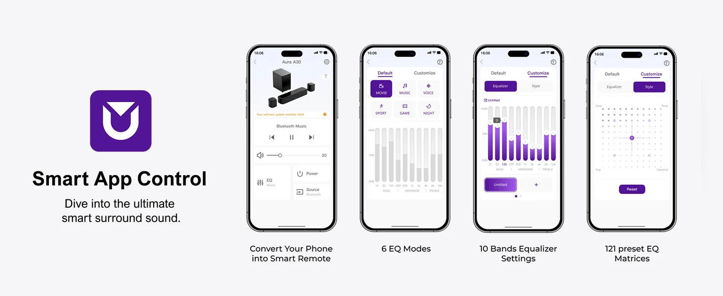 Customize your sound like never before using the Ultimea Smart App. Switch between multiple EQ modes, adjust frequency bands, and tweak treble, mids, and bass to create your perfect audio profile. With regular OTA updates, your Aura A30 always delivers top-notch performance.