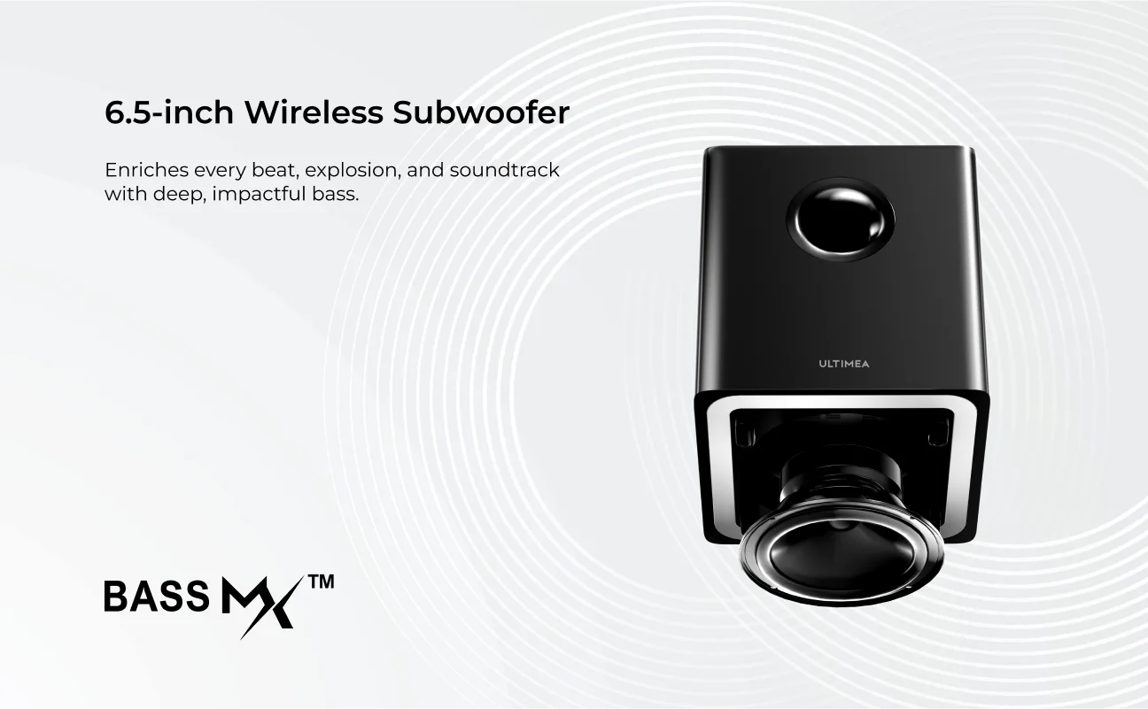 BassMX Technology: The robust 6.5-inch wireless subwoofer, with its optimized magnetic circuit and diaphragm, delivers rich, resonant low frequencies that let you feel every beat.