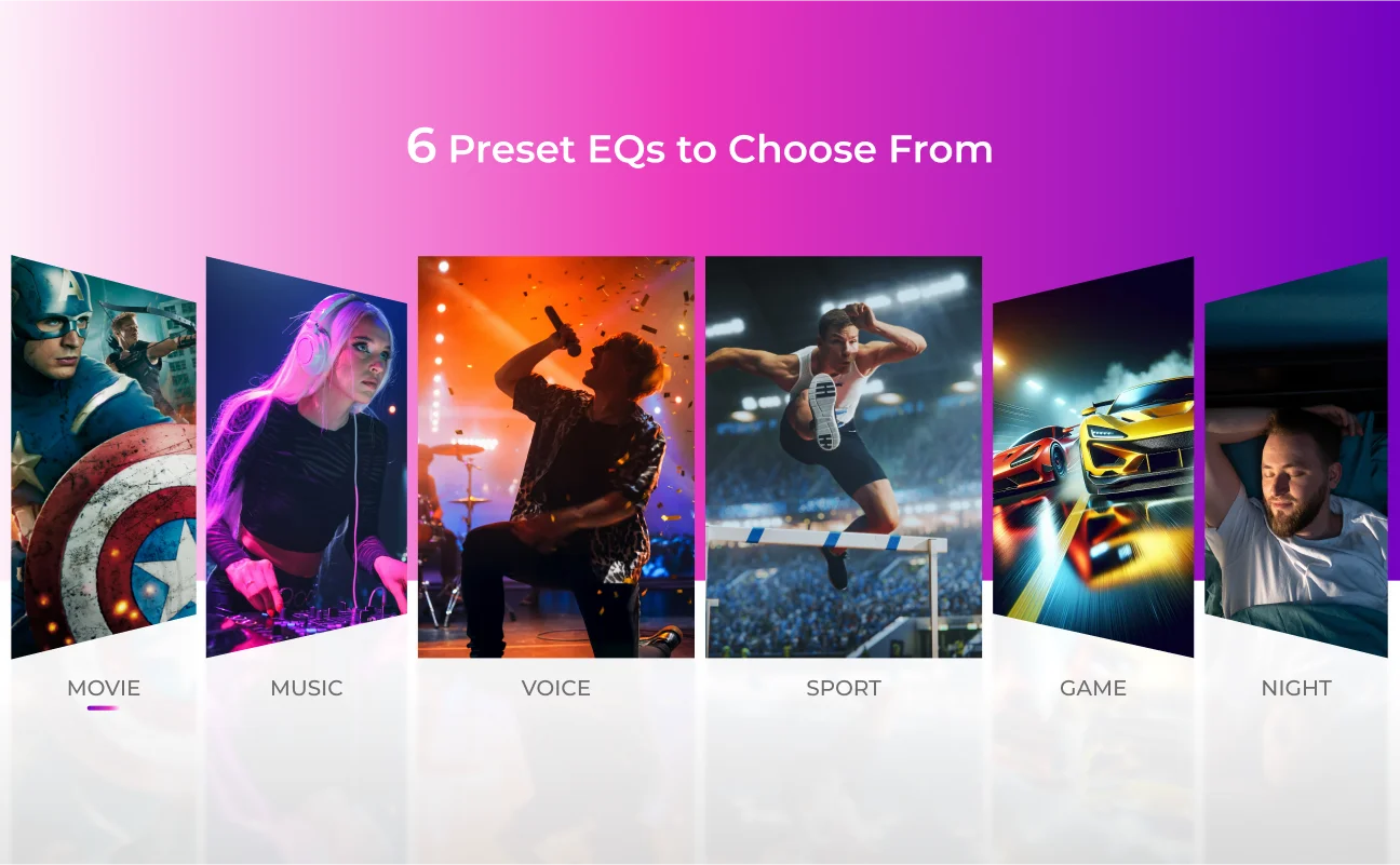 Ultimea App: Customize your audio experience with 121 expert EQ presets and 10-band tailored modes (Movie, Music, Voice, Sport, Game, Night). The “Customize” feature lets you fine-tune every detail for a personalized sound profile.