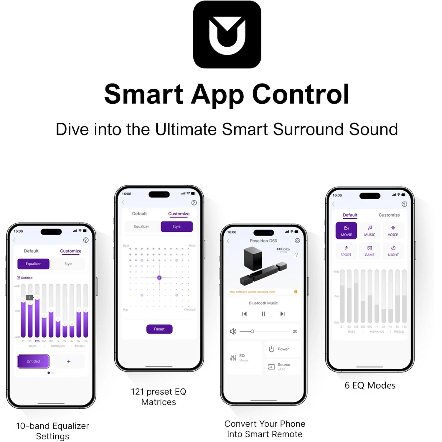 This sound bar for smart tv has three main channels for a crystal-clear dialogue, which improves capabilities of surround sound by adding two surround speakers and one wireless subwoofer. ULTIMEA sound bar with subwoofer applies Dolby Atmos technology which precisely pinpoints sound source, and makes all sound envelop you from all angles!