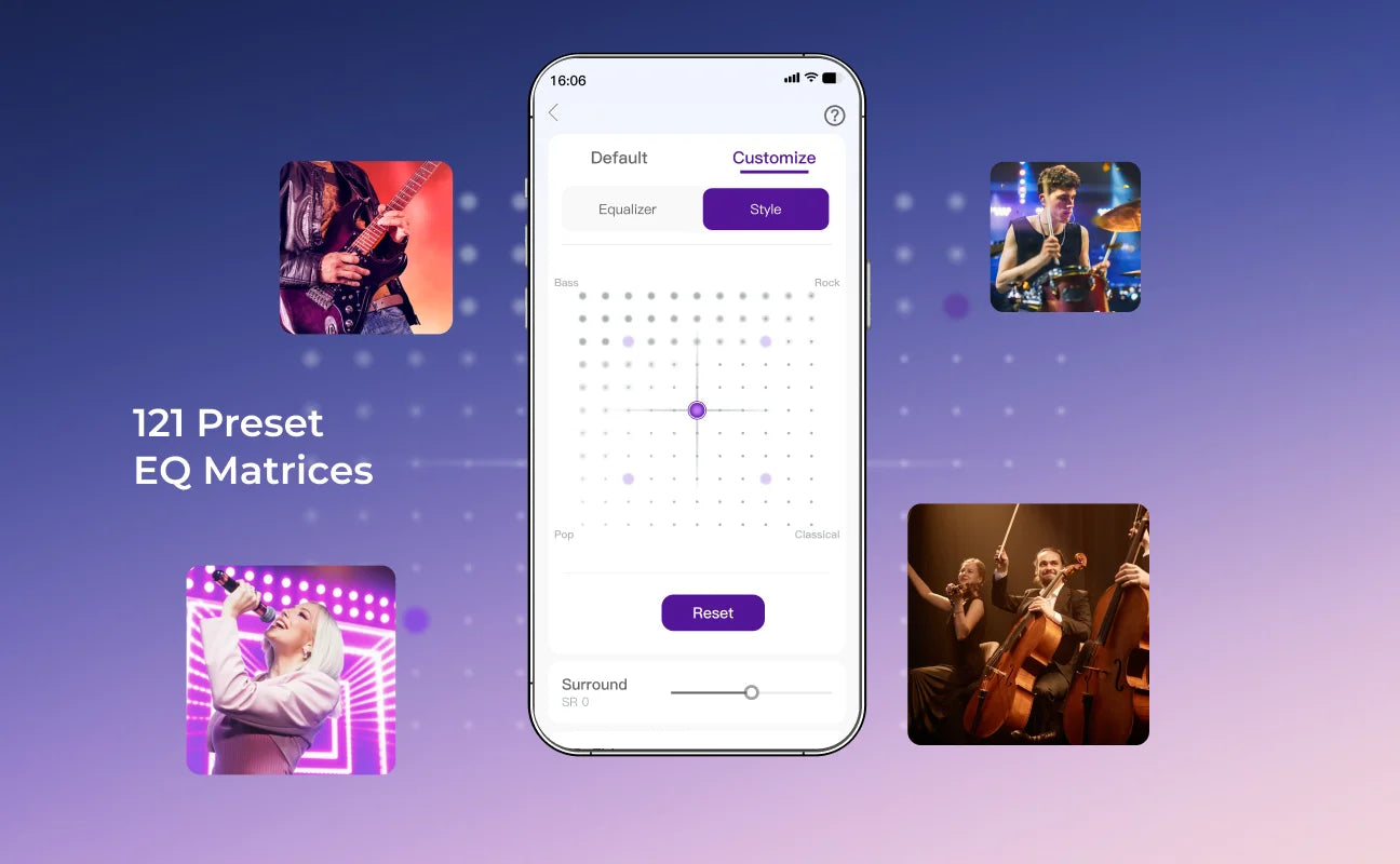 Unlock studio-grade control with the Ultimea Smart App. Choose from 121 professional EQ presets and 6 dedicated sound modes: Movie, Music, Voice, Sport, Game, and Night. Go deeper with a 10-band customizable EQ, letting you personalize every frequency to match your exact listening preferences.