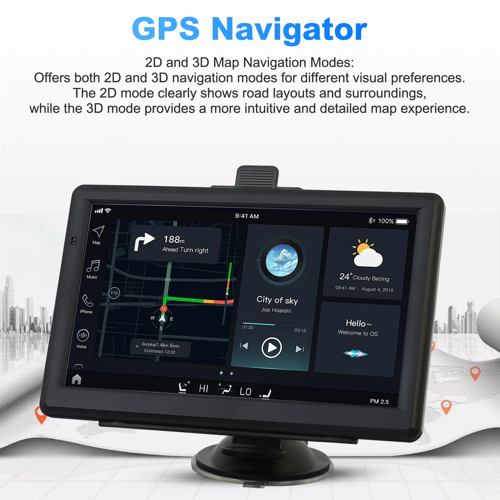 This 7-inch HD smart navigation device showcases crisp visuals with its 1024×600 ultra-high definition resolution, ensuring clear visibility even in bright sunlight for safe driving. It integrates smart navigation, cross-screen connectivity, and diverse entertainment options into one, supporting multiple languages for hassle-free global travel. With intelligent speed limit reminders and real-time traffic updates, it enhances your travel experience by keeping you well-informed and composed. Seamlessly connect your phone to the in-car system via Carplay/AUTO for effortless operation. Equipped with a multimedia player for music, videos, and e-books, it ensures your journey is never dull. Fully compatible with various vehicle types, it includes specialized dimension reminders for trucks to guarantee safe and efficient transportation. Coupled with a loud speaker and FM transmission, it delivers immersive audio throughout the car, making every trip enjoyable and reassuring.
